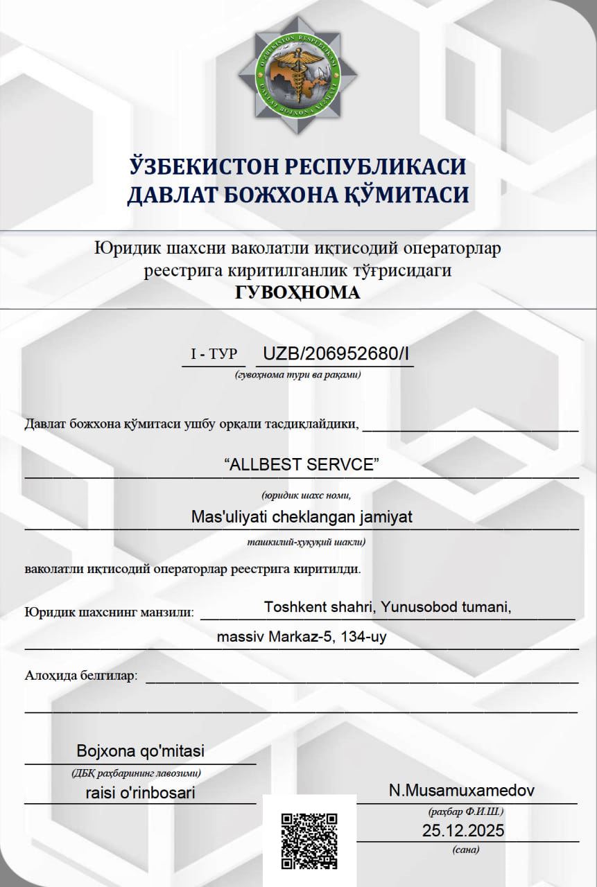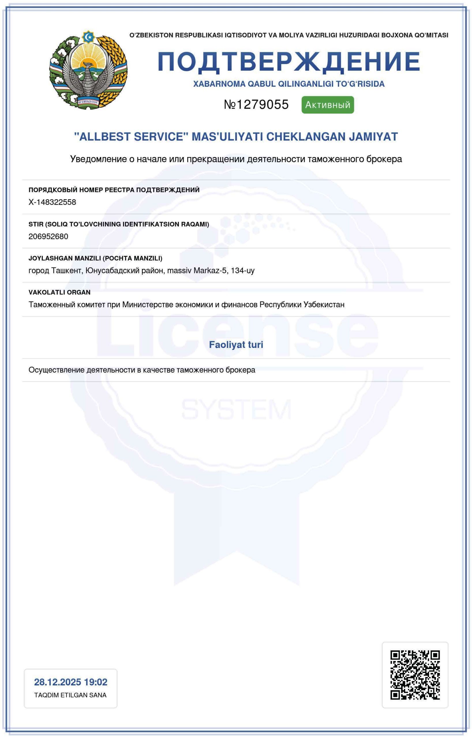 ООО «AllBest SERVICE» - Ведущий таможенный брокер на рынке Республики Узбекистан с 2008 года. Мы оказываем весь спектр услуг по таможенной очистке импортных грузов на всей территории Узбекистана, осуществляем все необходимые процедуры по экспортно-импортным операциям установленным таможенным Законодательством РУз. Выполняем транспортно-логические лицензированные услуги юридическим и физическим лицам, на высоком профессиональном уровне. Таможенный брокер профессионально решит вопросы в сфере внешнеэкономической деятельности, таможенного оформления и логистики.